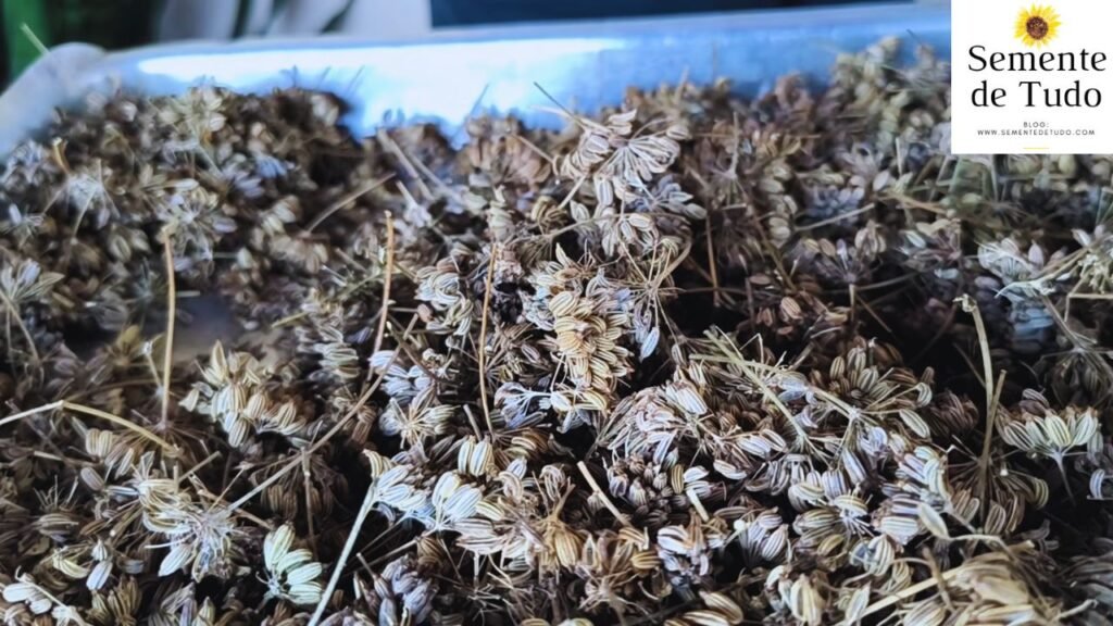 O funcho forma inflorescências em guarda-chuva, chamadas de umbelas, e é nelas que encontramos as sementinhas.